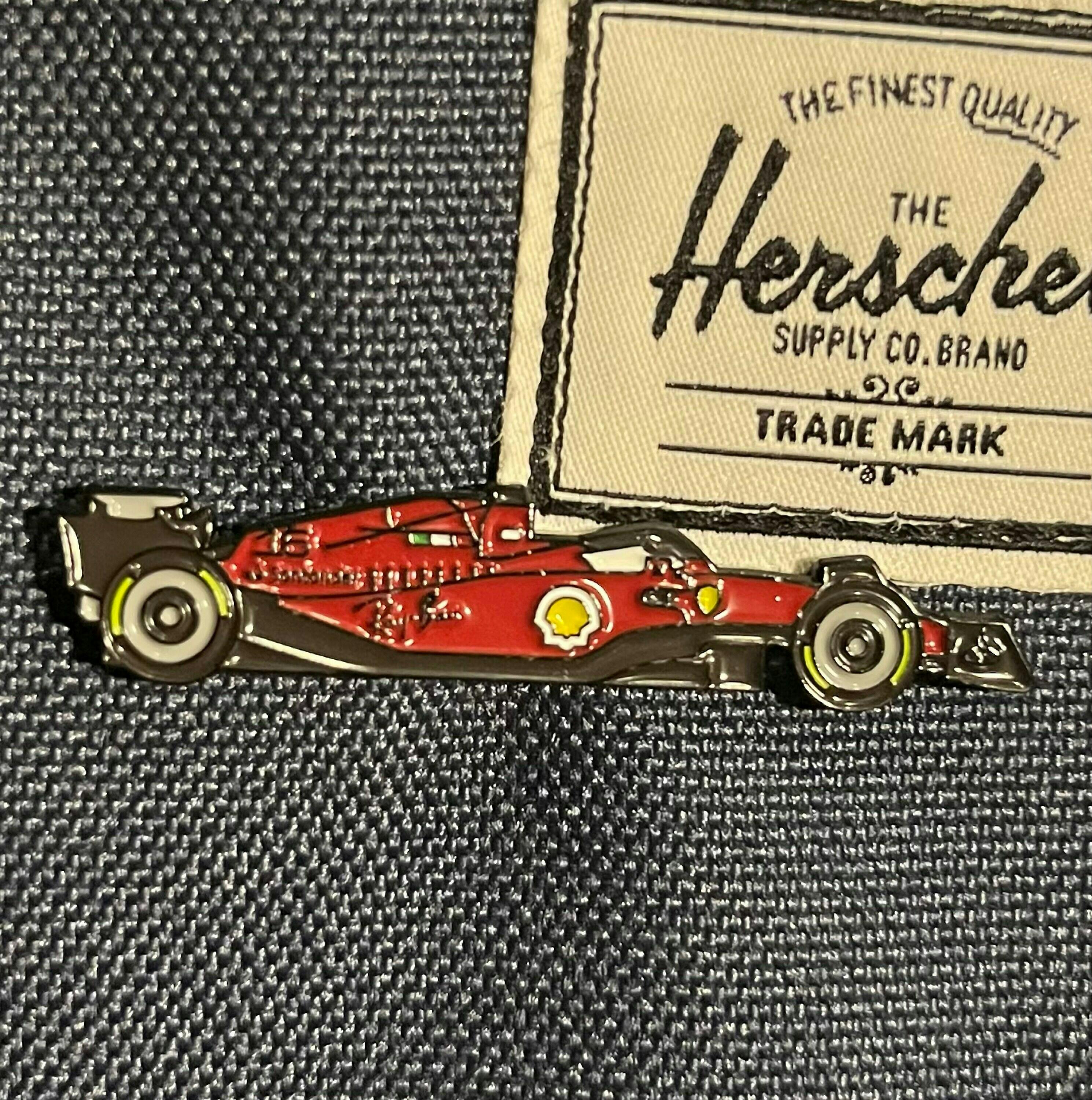 This is a 2 inch soft enamel pin of the Ferrari F1-75 raced during the 2022 Formula One championship.